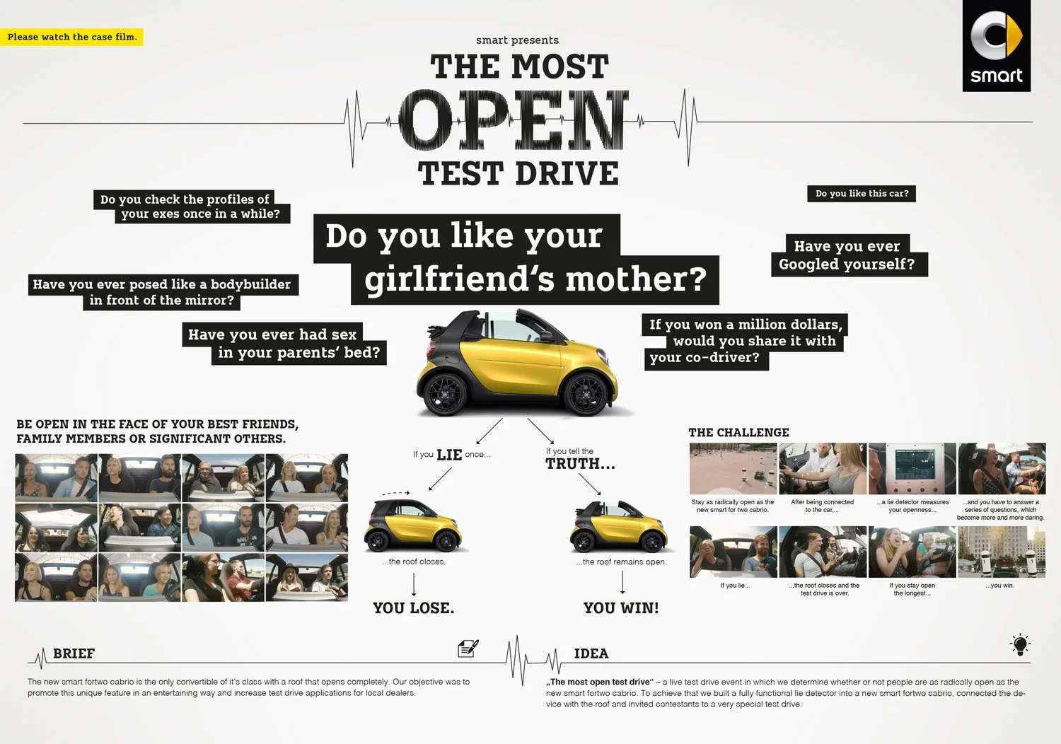 CONNECTED TO A LIE DETECTOR, THE TEST DRIVE ONLY CONTINUED AS LONG AS YOU WERE RADICALLY OPEN. BECAUSE IF YOU WEREN'T, THE TOP OF THE CONVERTIBLE CLOSED AND YOUR CHANCE TO WIN A GREAT PRIZE WAS OVER.